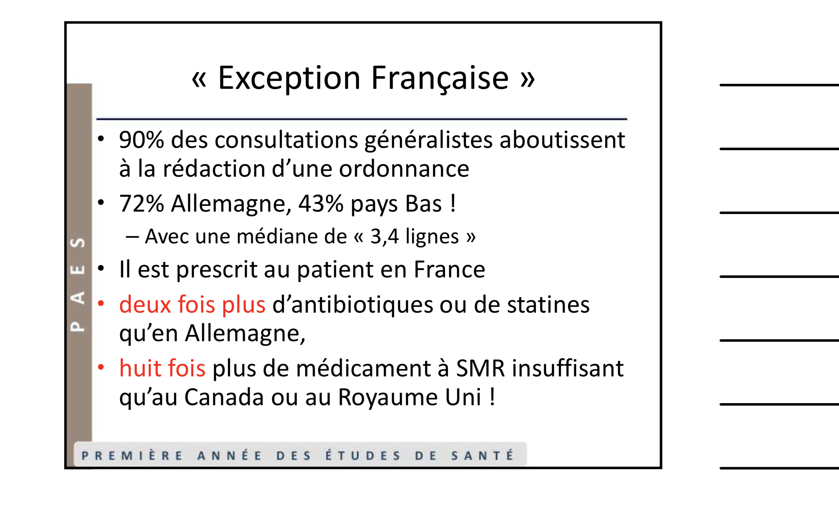 j'ai un probleme avec la ronéo 8 page 13 qui ne correspond pas au diapo : il est écrit dans la ronéo " en France, la médiane est à 3,4 lignes sur une ordonnance", alors que dans la diapo c'est un sous tiret du point qui parle de l'Allemagne et des pays bas.
