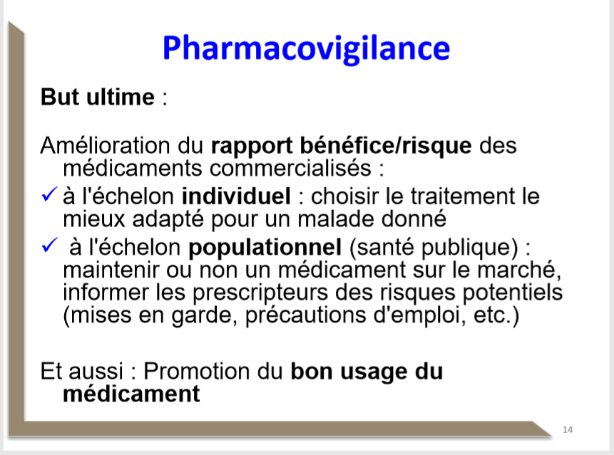 Juste pour etre sure, dans la ronéo il est dit que "donner des recommandations aux prescripteurs via le Vidal" est un objectif "général" de l'amélioration du B/R alors que selon le diapo informer les prescripteurs des risques,etc est plutôt un objectif à l'échelon populationnel