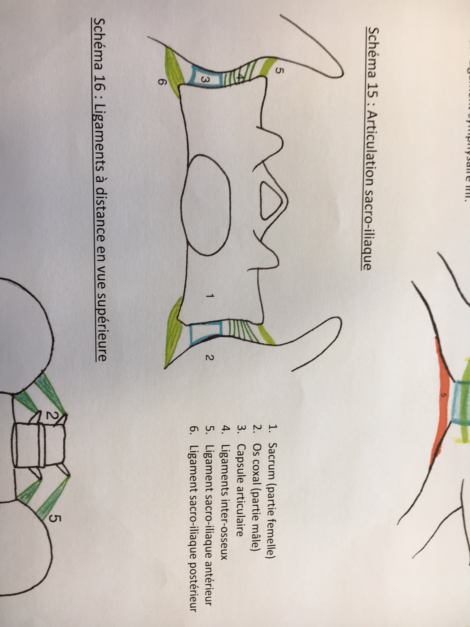 je suis actuellement entrain de revoir les ronéos de l'année et quelque chose m'a interpellé. Dans la ronéo 2 de l'année dernière il y a un schéma ( le 15 ) sur l'articulation sacro-iliaque en vue sup, et j'ai un petit probleme avec la legende du schéma, en 5. on nous dis que ce sont les ligaments sacro-iliaque antérieur or pour moi ça serait les ligaments sacro iliaque postérieur peut être que je me trompe... Je joint le schéma a mon explication pour que ça soit un peu plus clair, désolé si ça parait confus...