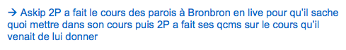 Surtout que quelque fois 2P dit en cours "mais ça on vous la déjà dit normalement" en parlant du cours de Bronsard sauf que Bronsard ne nous la pas dit.. Ducoup est ce que 2P est au courant que on nous la pas dit ou pas? Et est ce que Bronsard ne nous la pas dit exprès vu qu'il sait que c'est pas dans les qcms de 2P?