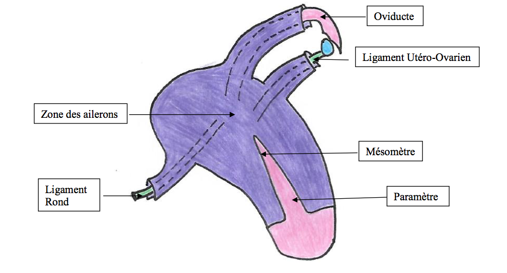 Et on divise cette zone en 3 étages : l'étage supérieur = étage des ailerons (où là on retrouve le péritoine sous tendu par 3 éléments qui forment les ailerons) / moyen = mésomère / inférieur = paramètre