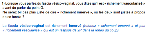 Oui j'avais remarqué cette anomalie surtout que d'habitude dans le cours sur les organes il dit bien "richement innervé" en parlant du fascia vésico-vaginal! Mais je ne me suis pas permise de changer au cas où! Donc tu fais bien de relever cette notion, je la rajoute tout de suite dans les questions à lui envoyer par mail après la sdr ou au mieux lui demander demain mais il y a déjà pleins de questions sur toutes les ambiguïtés de notre cher 2P :rotfl: