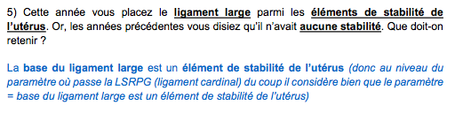 Donc il considère bien le ligament large comme un élément de stabilité de l'utérus notamment "la base du ligament large" et du coup si il met le paramètre il faut le compter VRAI donc au moins vous savez quoi mettre le jour J :D