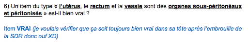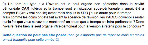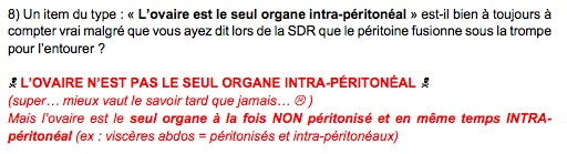 2) L'item reste vrai "l'ovaire est le seul organe intra-péritonéal" à partir du moment où il fait ses qcms en sortant de cours ou juste avant le cours donc pas après l'embrouille de la SDR :P Mais ça tombe bien, j'ai envoyé le mail des dernières questions qu'on voulait lui poser tout à l'heure où j'ai carrément mis 2 questions à ce sujet par rapport à cet item justement et aussi un autre donc j'espère qu'il répondra et qu'on sera fixé mais les qcms ne changent pas selon la SDR donc restez sur la version dite en cours chaque année "l'ovaire est seul organe intra-péritonéal"