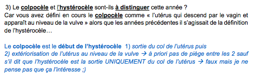 2) Je vous passe l'hystérocèle en double parce que c'est pas cool que vous soyez tombés dedans car le prof a changé sa version mais c'est parce que c'est le dernier tut que je vous l'accorde car c'est bien dit dans la ronéo tel quel et 2P aurait piégé entre "vessie" ou "rectum" à la place "d'utérus" ou "col" mais je ne pense pas entre col et utérus il n'est pas si fourbe