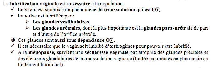 Je suis dac avec vous je pensais vraiment avoir mis "Car la LUBRIFICATION de l'appareil génital féminin ..." qui aurait été juste puisque 2P dit cela cette année dans la ronéo 2 :