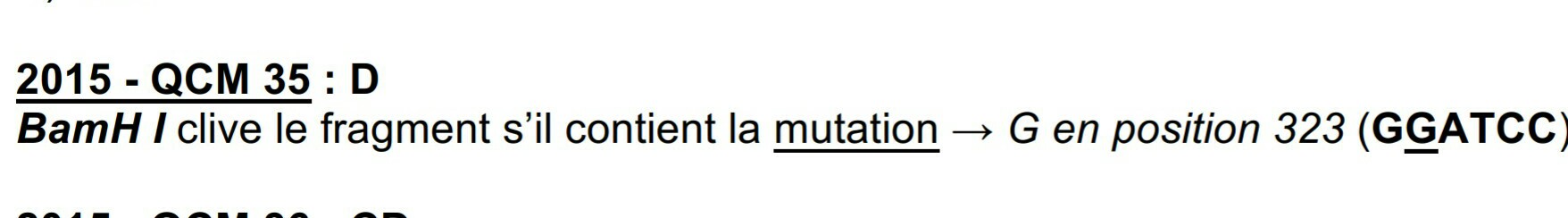 Du coup pour ton qcm tu ne pourrais utiliser que BamHI qui reconnaît exactement la séquence mutée (si un nucléotide change entre la séquence et le site de restriction de l'enzyme c'est pas bon il faut vraiment avoir la même séquence au nucléotide prêt)