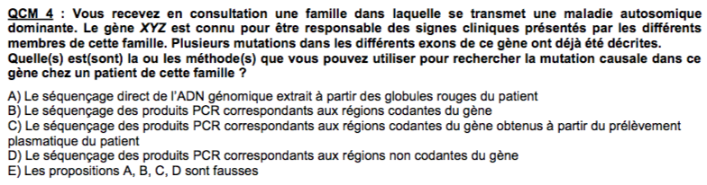 Cet item est donc faux car même si pour rechercher plusieurs mutations dans un gène on peut faire une PCR - Séquençage, on ne peut pas travailler à partir de plasma pour la faire, il nous faut un prélèvement sanguin pour récupérer des cellules comme des leucocytes !