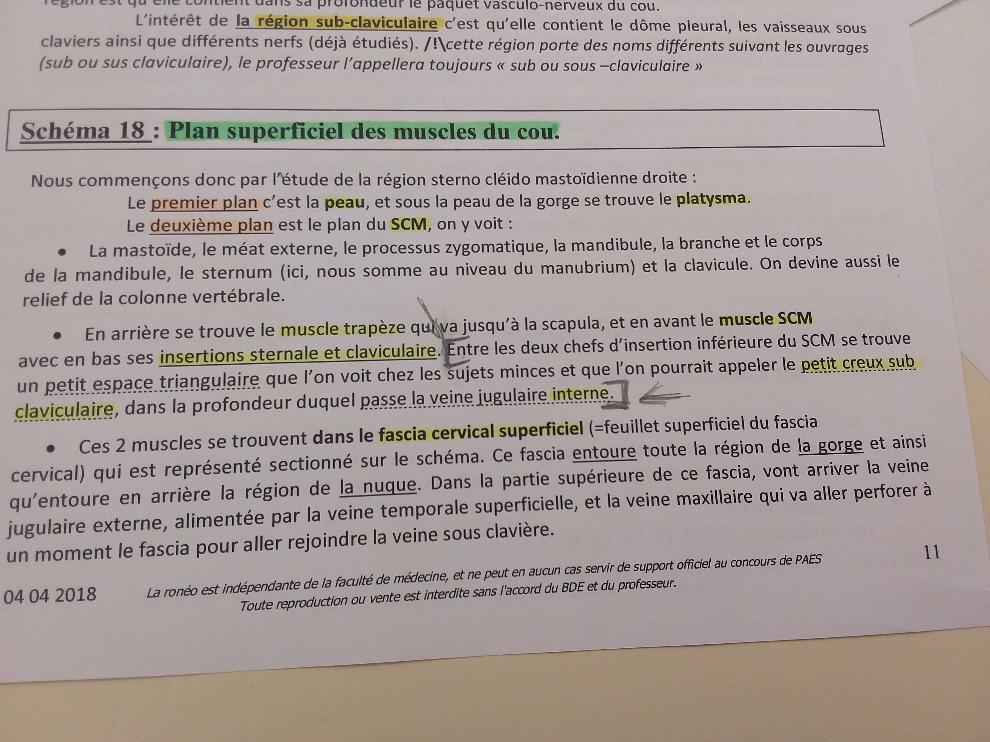 Comme je l'ai dit plus haut, la veine jugulaire interne passe dans la profondeur du petit creux sub-claviculaire donc c'est normal qu'elle soit pas sur le schéma 18 qui présente la superficie de la région. La veine jugulaire externe passe en dehors du SCM et pas dans l'écartement de ses faisceaux.