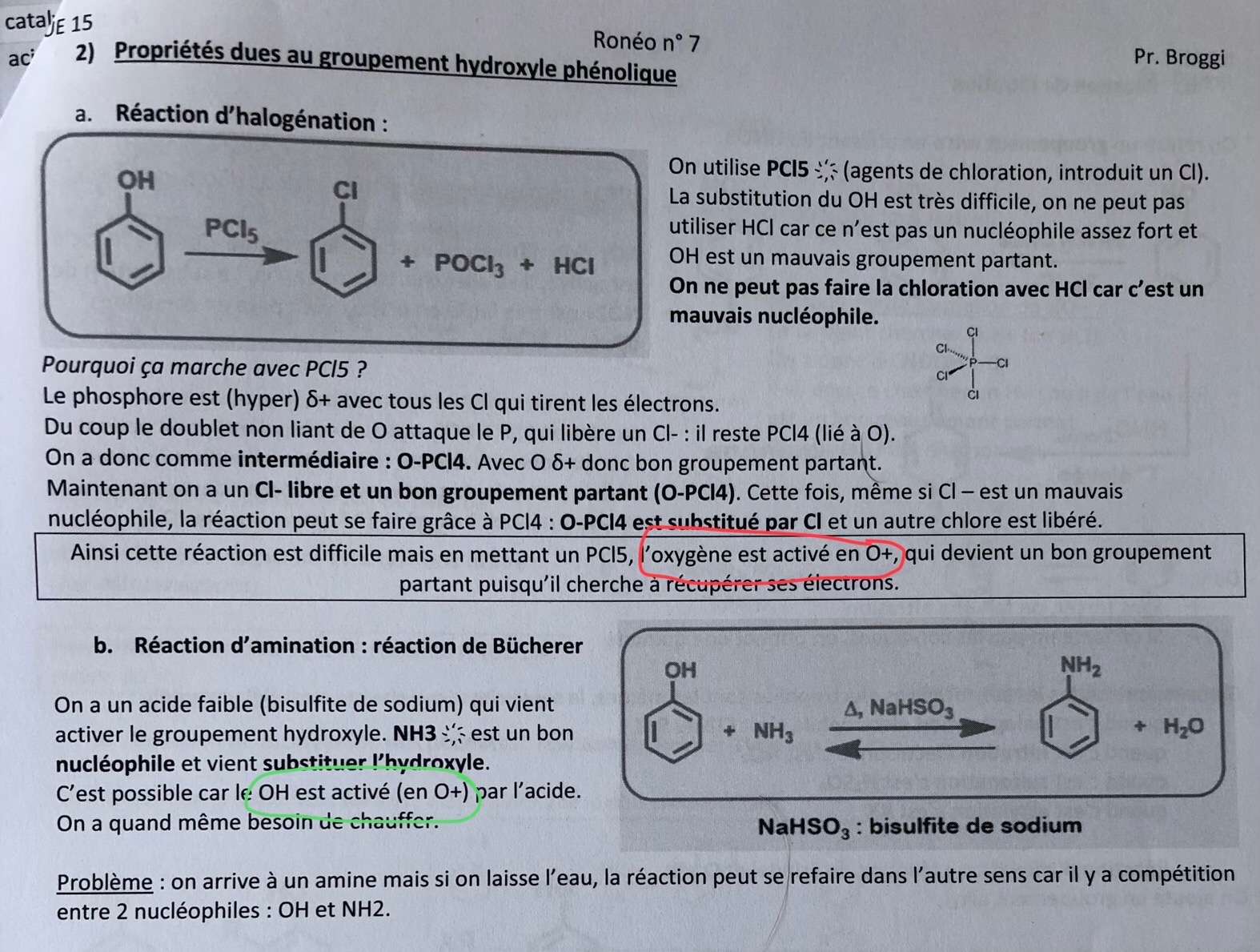 Et ensuite dans la réaction d'amination cette fois ci, l'oxygène est aussi postive, car je cite : "le OH est activé par l'acide" je l'ai mis en vert sur la photo. Je comprend pas ce que ca signifie "activé par l'acide".