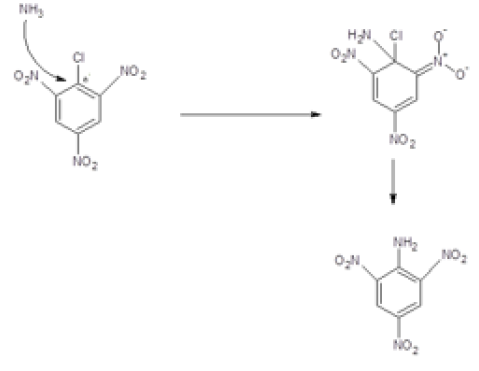 Du coup quand NH2 va venir se mettre sur le carbone du chlore alors il va pouvoir y avoir une délocalisation des électrons par mésomérie dans le groupement nitro, d'où l'importance qu'il soit en ortho et non en méta (ça ne marche pas en méta)