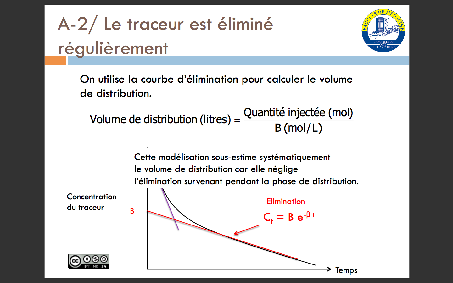 Pour calculer Vd on utilise au dénominateur la concentration B qui est obtenu en prolongeant la droite d'élimination jusqu'à l'axe des ordonnés en considérant l'élimination constante dès l'injection du traceur.