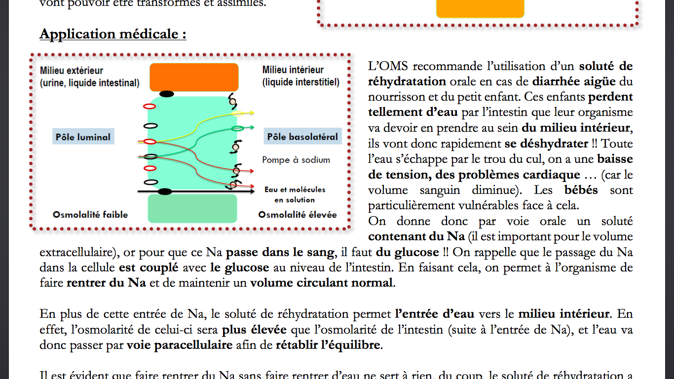 Je te mets la partie du cours sur ça; l'eau et les molécules dissoute vont bien aller vers le milieu d'osmolarité élevée (grâce au glucose++ qui va permettre au Na d'entrer).