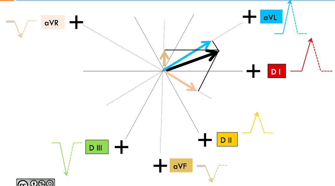 Par définition le centre de ce triangle a un potentiel toujours nul, on défini donc que les bornes positives sont situées aux extrémités de ces bissectrices. On a alors : en aVR la borne positive qui est au niveau du bras droit, en aVL la borne positive qui est au niveau du bras gauche et en aVF la borne positive est au niveau du pied. Si on a un vecteur verticale dirigé vers le bas : en aVF la projection sera positive, et en aVL et aVR les projections seront négatives (puisque aVR et aVL sont un peu obliques).