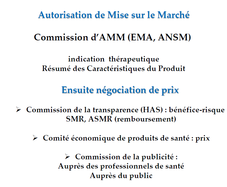 Dans la partie sur l'AMM la prof dit que celle-ci contient le prix et le remboursement. Normalement le prix et le remboursement sont déterminés après le dépôt de l'AMM, et sont différents dans chaque pays alors que l'AMM elle reste la même de partout, du coup dire que c'est dedans me pose problème...