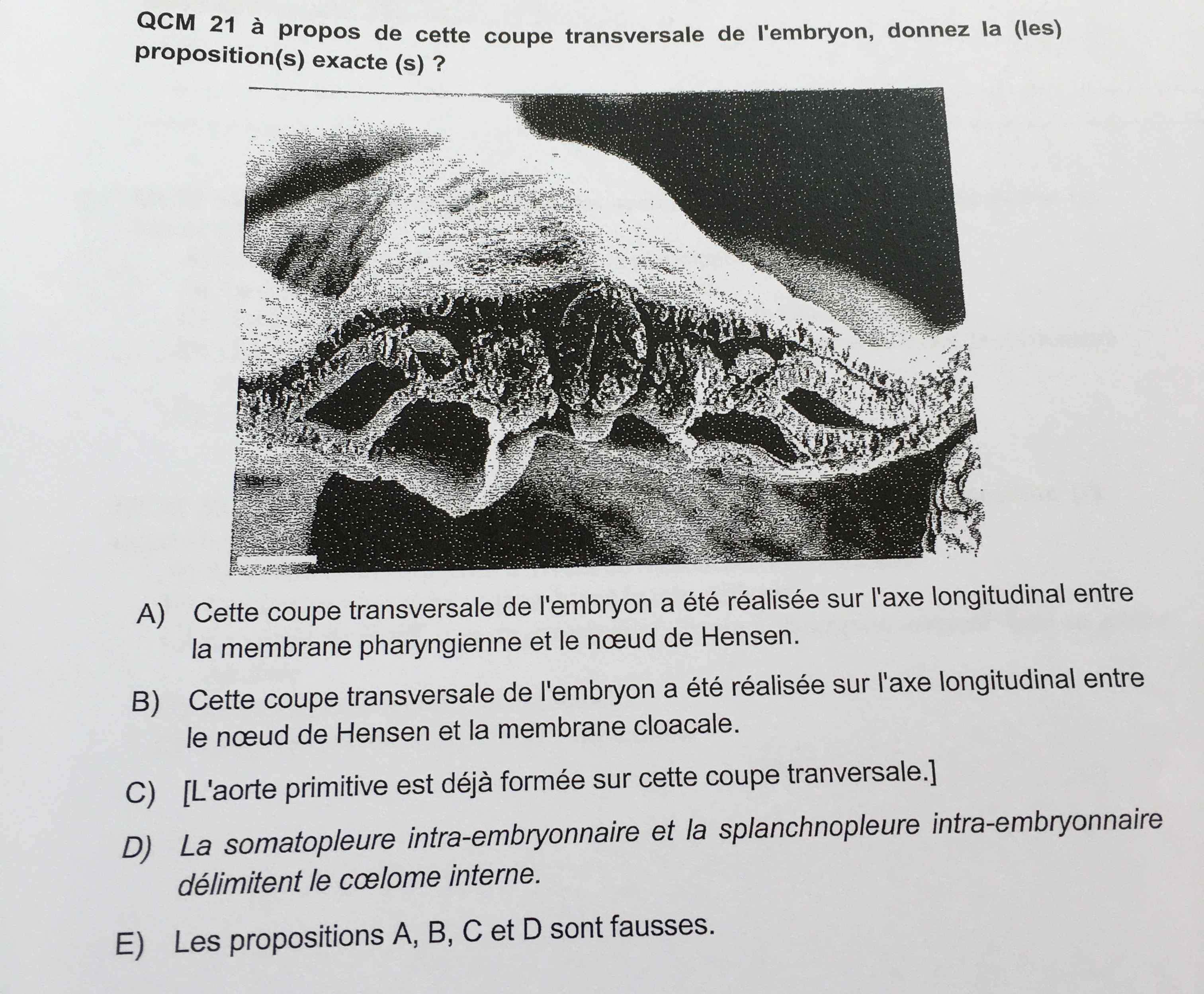 Bonjour, ce qcm me pose problème, les réponses justes sont A et D. Pourquoi est ce que cette coupe ne peut pas avoir été prise entre la membrane cloacale et le noeud de hensen ? Et aussi on est daccord qu'on ne voit pas vraiment le coeleme interne avec les 2 lames sur cette photo, juste on peut conclure que l'item est vrai sachant que le tube neural s'est fermé ect