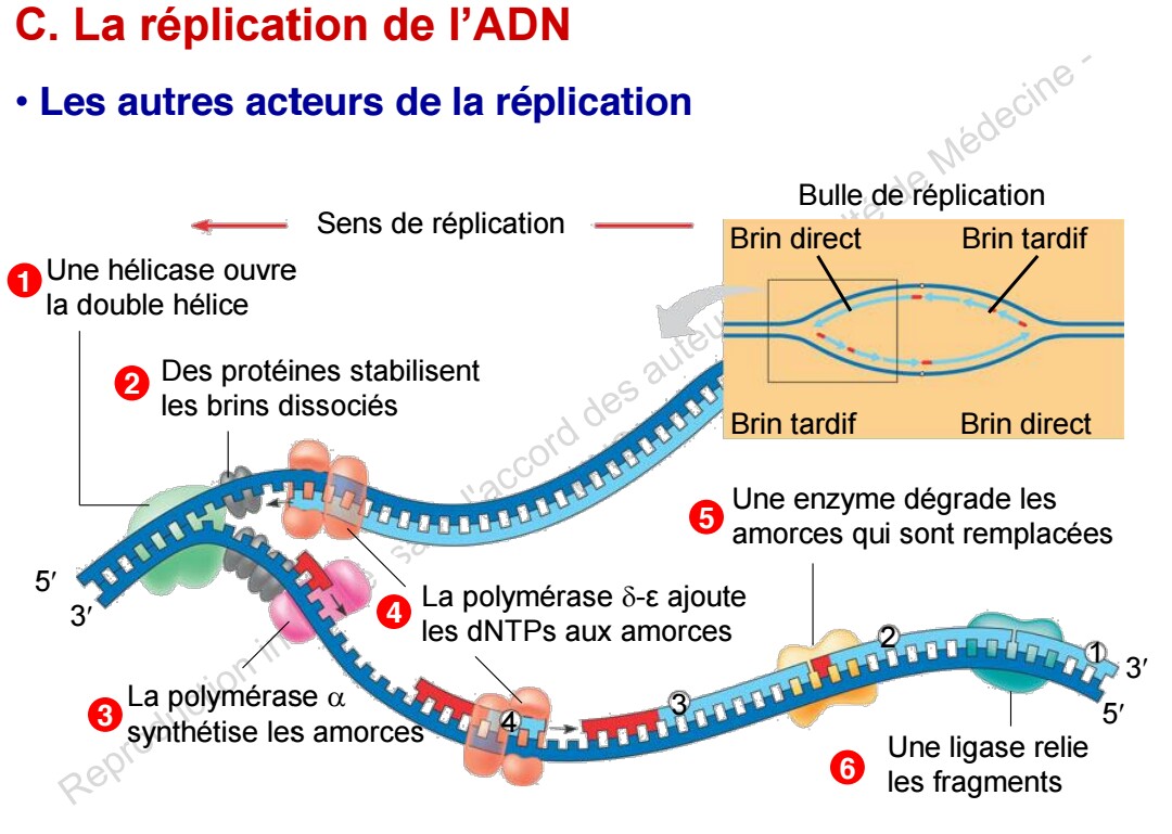 Si on est au niveau d'un brin direct la polymérase alpha n'aura besoin d'intervenir qu'une seule fois pour synthétiser une amorce, la polymérase delta-epsilon terminera son travail toute seule, mais si on est au niveau d'un brin tardif on aura besoin de plusieurs amorces et donc la polymérase alpha devra intervenir à plusieurs reprises pour permettre à la polymérase delta-epsilon de terminer son travail !