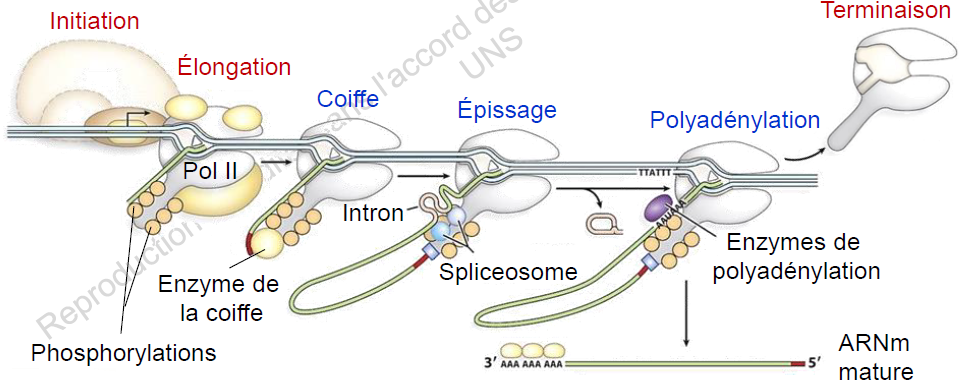 Dans le diapo de la tut rentrée p 38 il y a la phrase suivante : "d'autres phosphorylation de l'ARN polymérase II recrutent successivement les enzymes de maturation du pré ARNm" = juste pour être bien sûr on doit comprendre cette phrase dans le sens qu'après la phosphorylation initiale permettant le démarrage de la transceiption on va avoir d'autres phosphorylations qui vont attirer cette fois les enzymes de maturation permettant la mise en place de la coiffe, de l'épissage etc ?