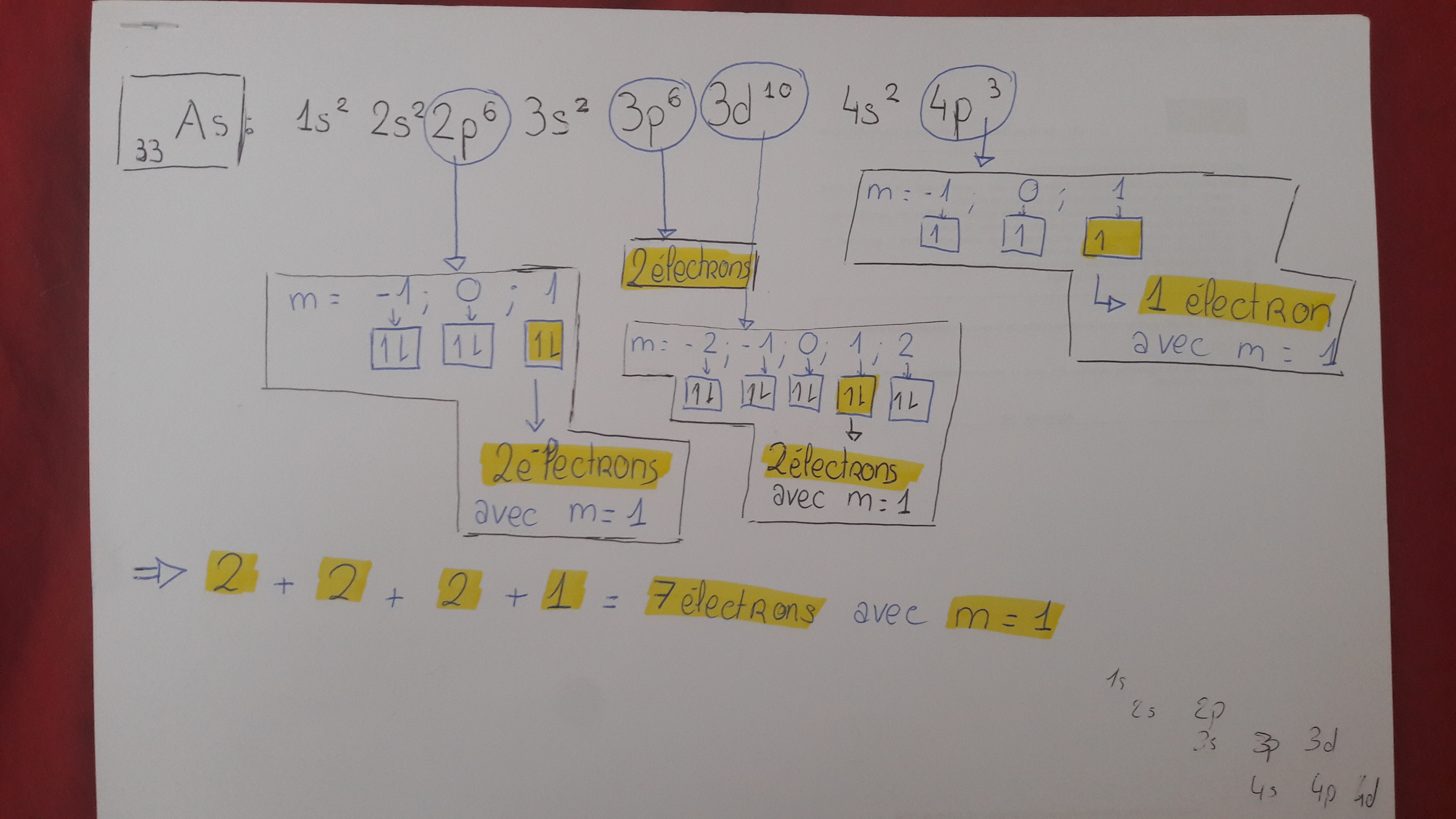 -> Pour la couche de valence, je te conseille de dessiner les cases quantiques si les OA ne sont pas pleines pour obtenir ton nombre d'électrons compris dans la case m=1