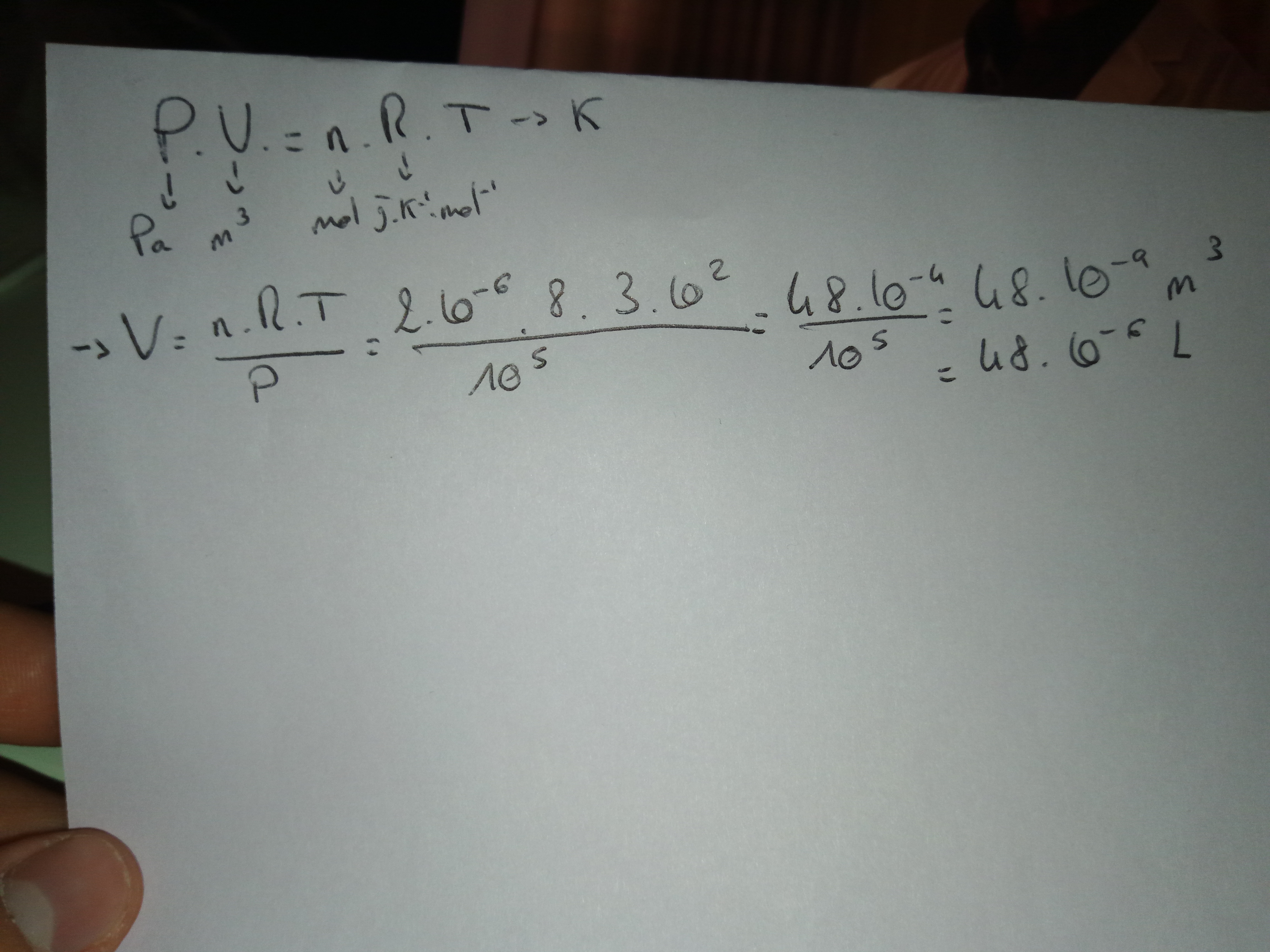 sujet : dans un ballon de baudruche, la pression vaut P0, le température est de 7°C et on retrouve 2.10^(-6) moles de protoxyde d'azote. Donné : R = 8 J.(K.mol)^(-1). Donnez le volume correspondant.