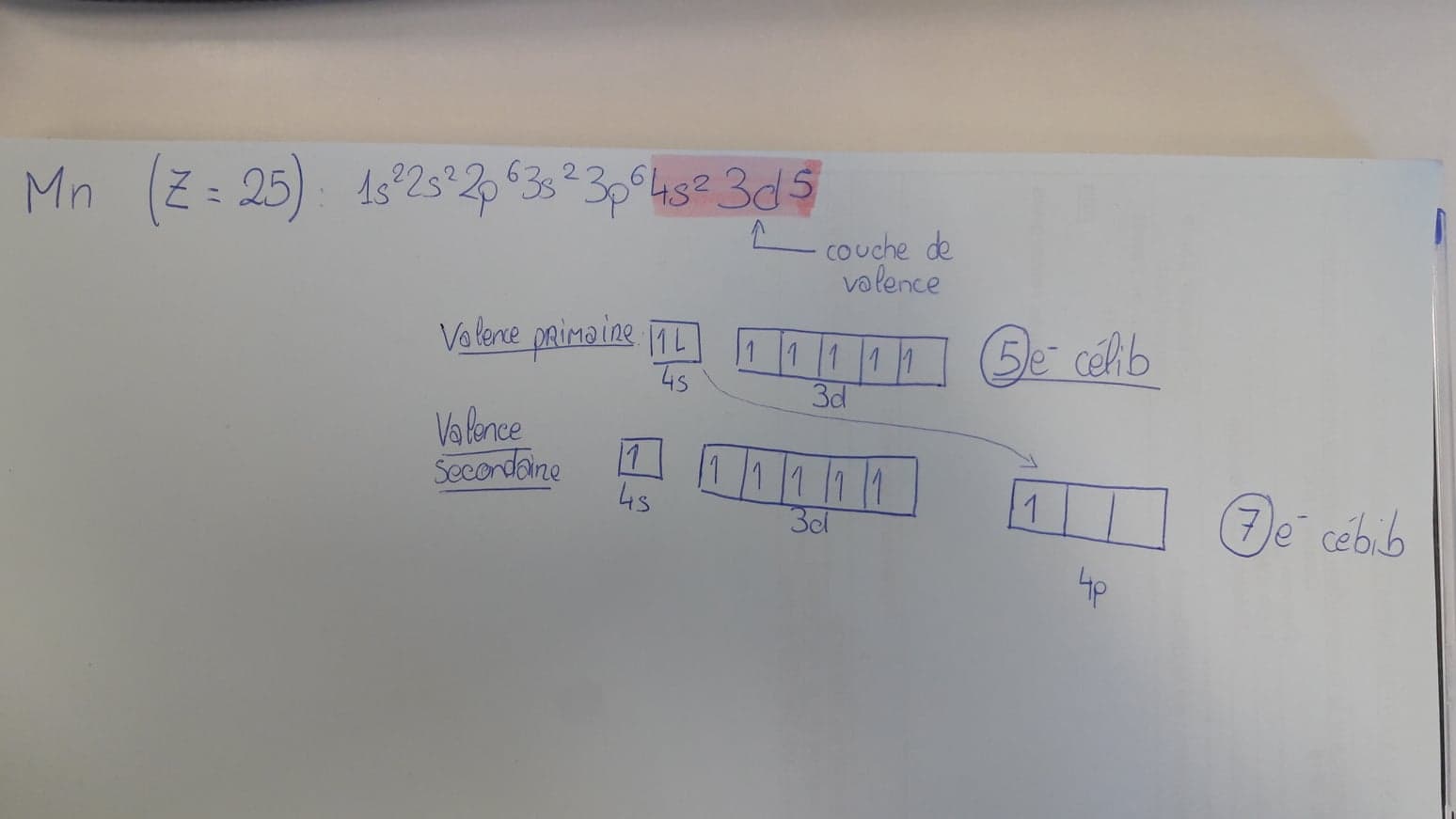 Je t'ai fait le dessin ici, on voit bien qu'en valence principale il y a 5 électrons célibataires + 1 dnl en 4s2 puis en valence secondaire, on a 7 électrons célibataires :wink2:
