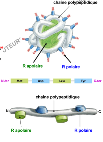 - ces AA polaire/hydrophile dehors/à l'exterieur de la proteine pour quelles puissent faire des liaisons ioniques et hydrogènes avec le solvant