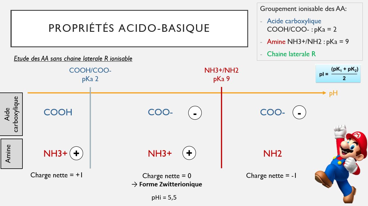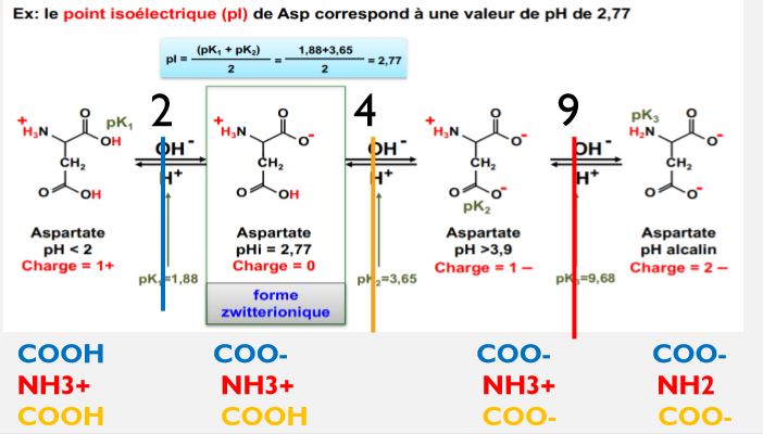 (On rappel que les pKa de la structure commune du COOH est de 2 et le pKa du NH2 est de 9) à connaitre