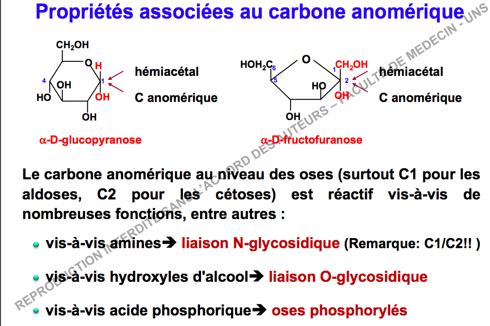 :arrow: Dans la catégorie des monosaccharides il parle du C anomerique ( qui a juste titre est évoqué dans la partie oses/monosaccharides) et nous dit que sur ce dernier peuvent "se produire" des liaisons de types N-glycosidique et O-glycosurique ( en référence à la diapo 29 du cours des glucides où dans la partie des oses il évoque à titre de présentation générale les différents types de liaisons ).