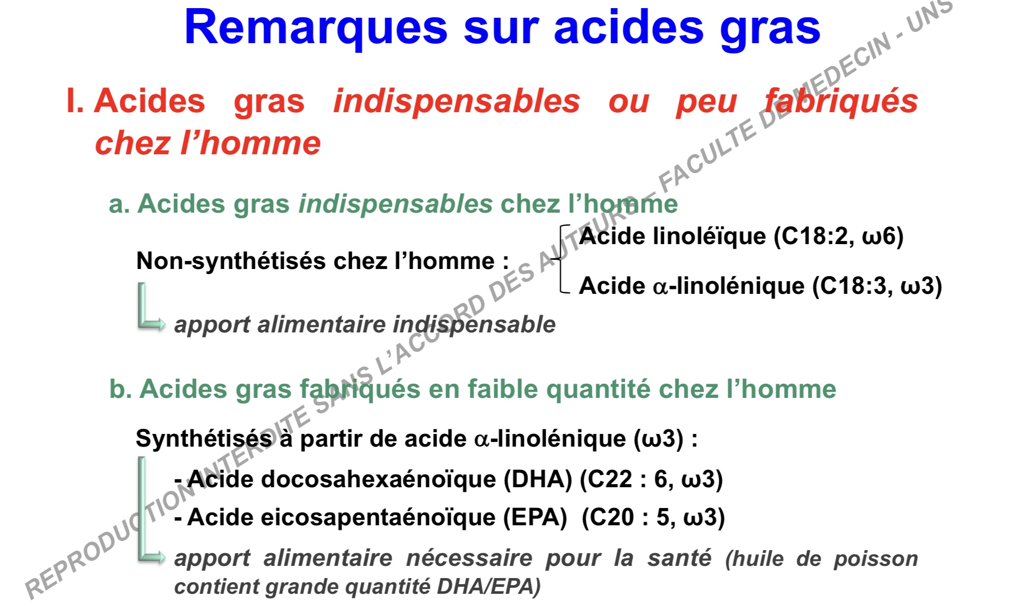 Alors fait attention, cette année le prof fait bien la distinction entre les AG indispensables (acide linoléïque, acide α-linolénique) et les AG fabriqués en faible quantité chez l’homme (acide EPA, acide DHA) !