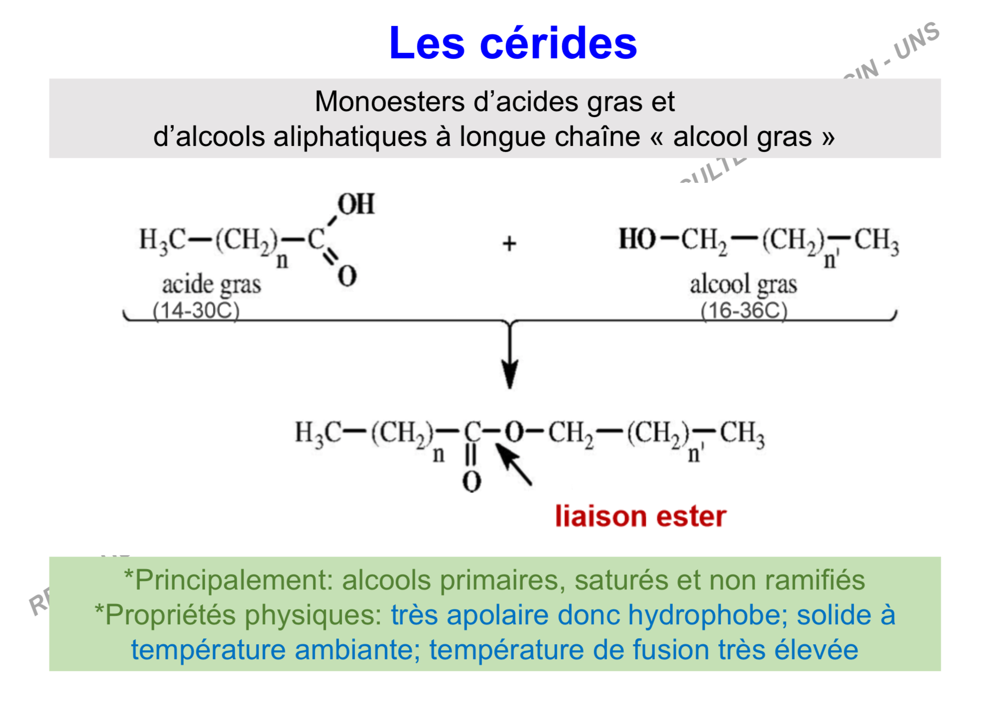 Pour les cerides, la structure linéaire donnée, est-ce pour la molécule en général ou simplement pour l'acide gras? Et cette structure est de 16-36 C ou 14-38 C? car dans le cours du prof, c'est 14-38 et dans la fiche du tutorat c'est 16-36. Est-ce bien les chiffres du prof qui sont corrects?