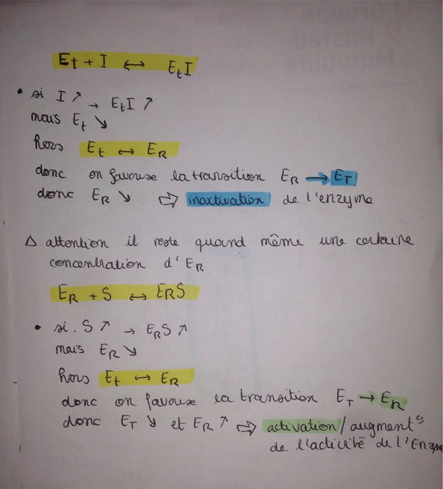 D'abord si tu regardes la courbe de la diapo 78, tu vois que même avec un inhibiteur allostérique, une augmentation de la concentration en substrat te permet d'atteindre a Vm max! Donc une augmentation de la concentration en substrat permet une transition allostérique de la forme T => R de l'enzyme!