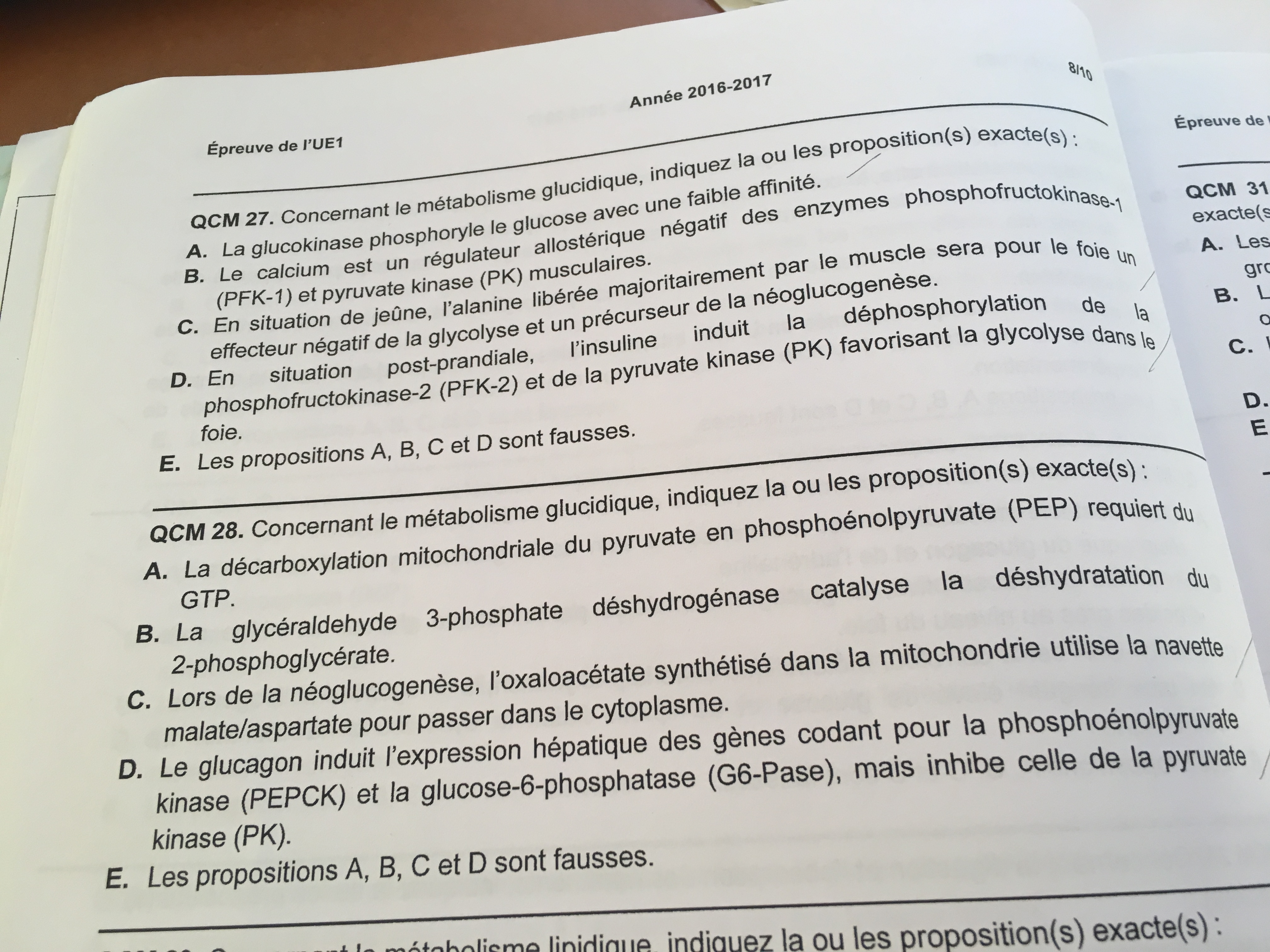 en fait pour moi c'est faux psk on ne peut pas parler dacarboxylation du pyruvate en PEP directemement ... on passe d'abord par l'oxaloacetate. donc un item qui dit : "dacarboxylation du pyruvate en PEP " je le compte direct faux sans lire la suite ...