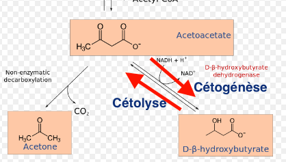La production SOIT de 3/B-Hydroxybutyrate (c'est la même chose avec deux noms différents, quand NADH majoritaire) SOIT d'acétoacétate (NAD+ majoritaire).