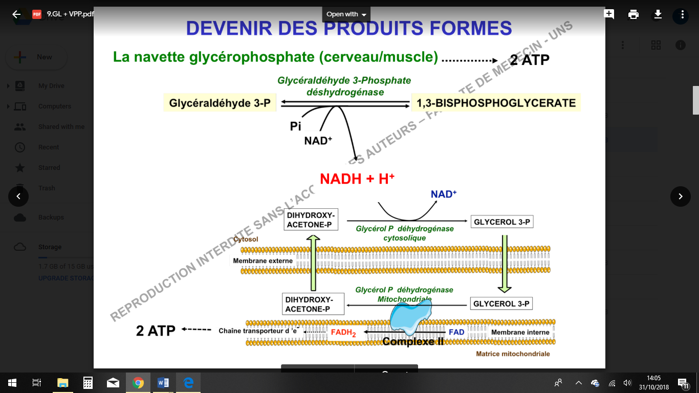 2. Il est converti par la Glycérol phosphate DH mitochondriale en DHAP avec réduction d’un FAD en FADH2 au niveau du complexe II présent sur la membrane interne