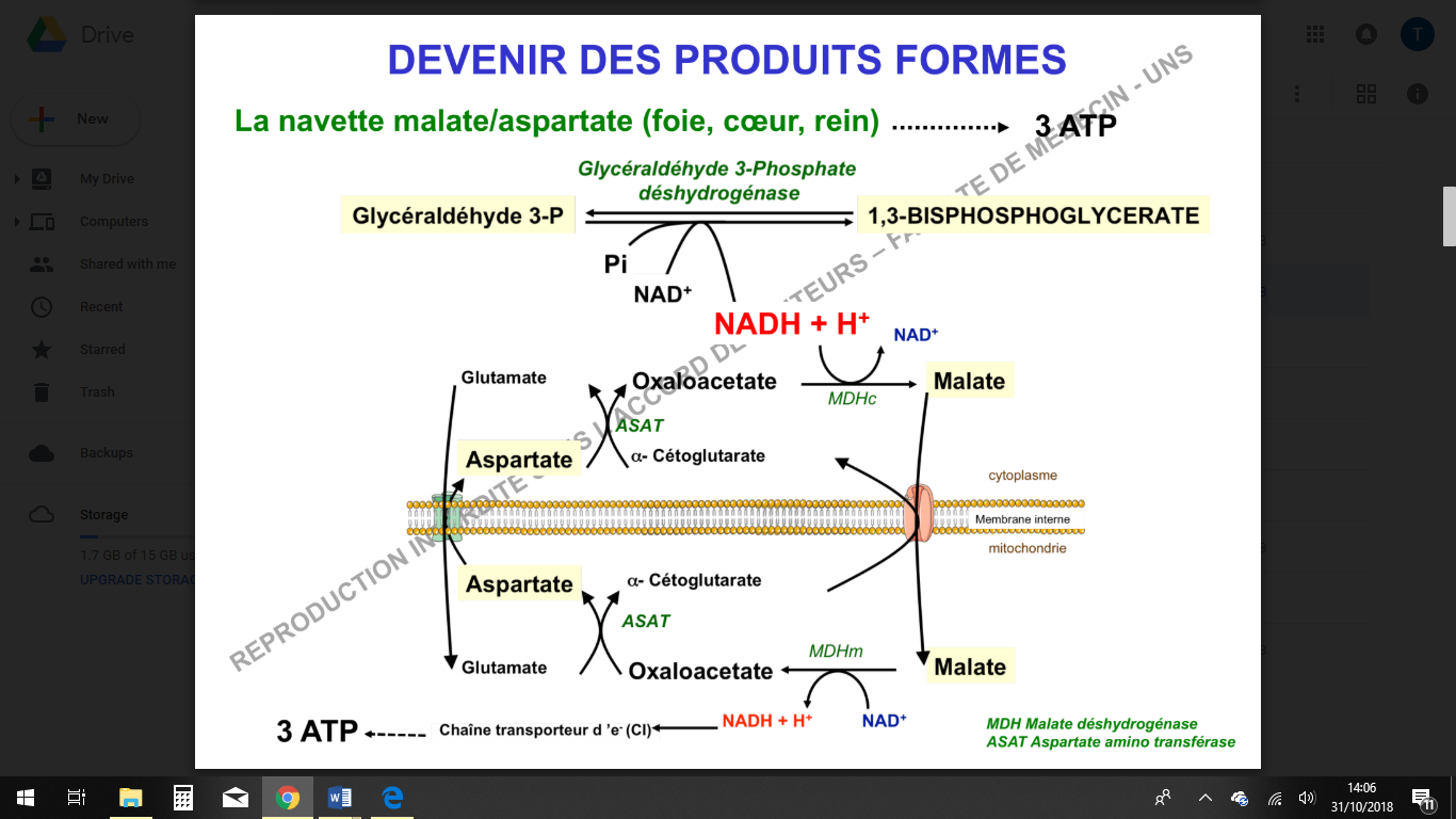 :arrow: On obtient donc un NADH + H+ dans la mitochondrie qui pourra alors s’engager dans la CRM au niveau du complexe 1 : production de 3 ATP/NADH cytosolique bref on s'égare