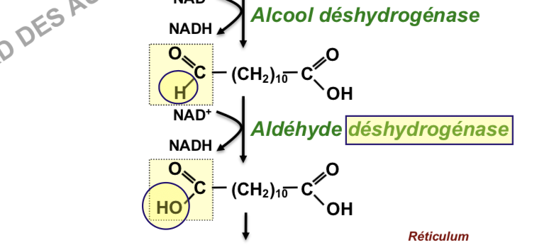 ENSUITE , dans la première étape il est dit qu'on ajoute NADPH, O2 mais sur le produit obtenu je ne vois qu'un O ; concernant la dernière étape il est que le cofacteur s'est réduit donc la molécule devrait perdre un H or on a toujours le même nombre de H avant et après la réaction catalysée par l'enzyme aldéhyde DH