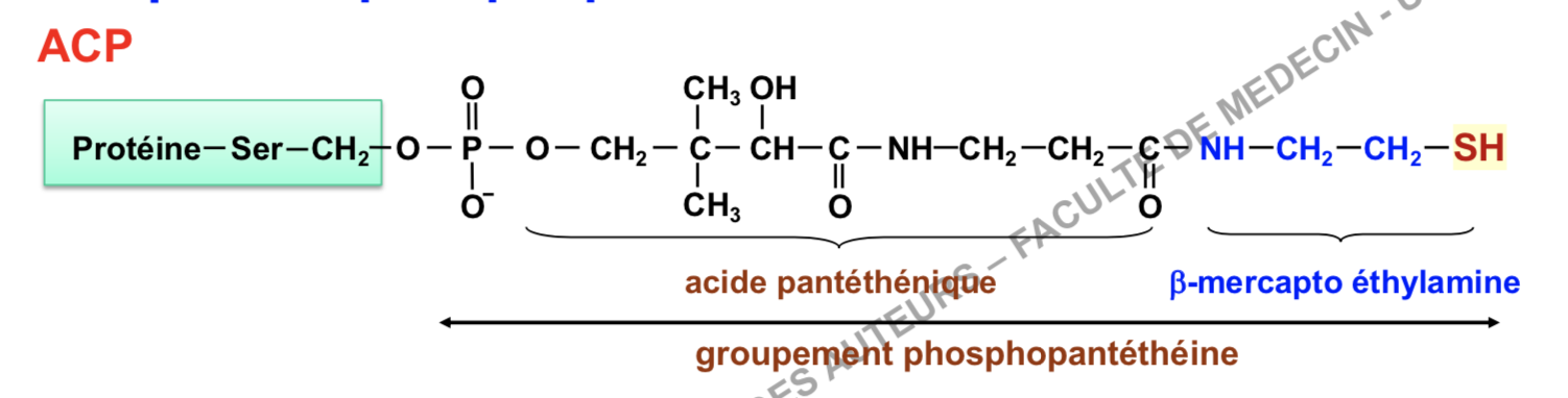 Acp = protéine + grp phosphopantéthéine (comprenant lui meme l'ACIDE panthetheique et B mercato éthylamine) ?