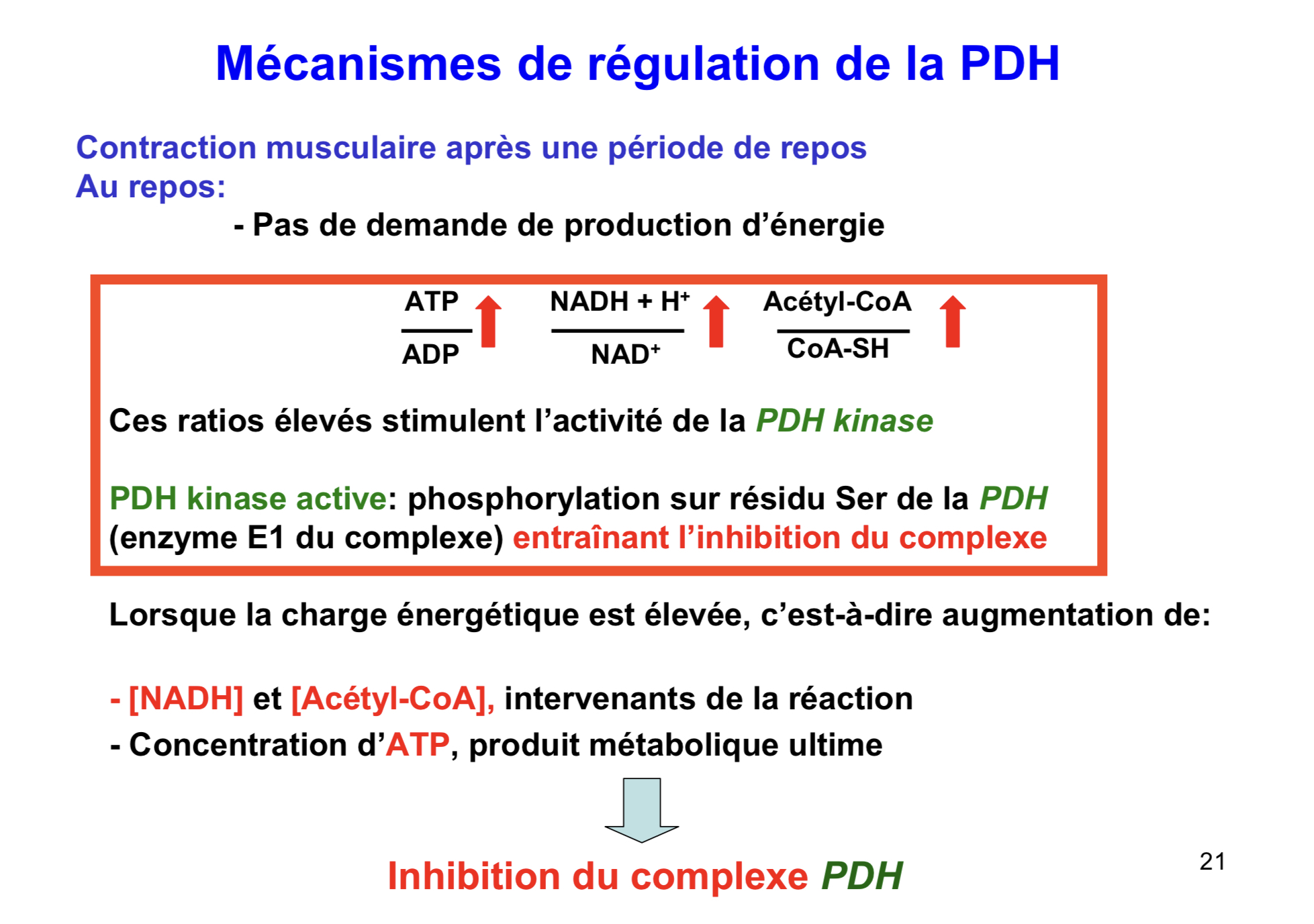 bonsoir, dans un qcms d'annale, l'item suivant " l'inhibition par phosphorylation de l'holoenzyme PDH ( E1) est une conséquence d'une augmentation des concentrations mitochondriales de NADH + H+ et d'acétyle COA " , je comprend pas pourquoi cette item est compté juste car selon moi la hausse de ces concentration inhibe E2 et E3. Tandis que E1 est inhiber par phosphorylation ..