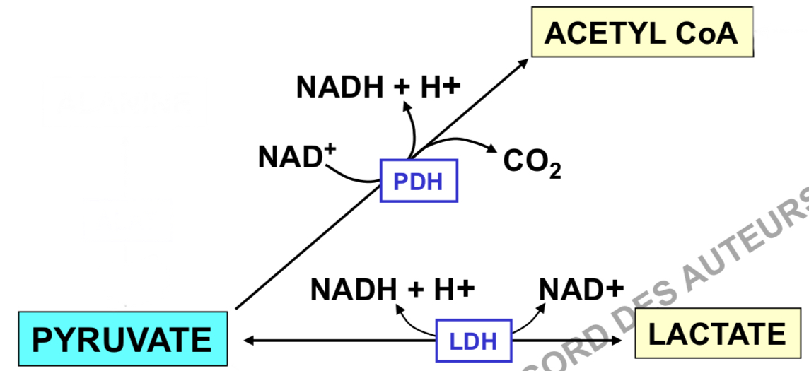 La réaction de décarboxylation du Pyruvate est catalysée par la Pyruvate déshydrogénase (PDH) et forme de l’Acétyl-CoA. Cette réaction est associée à l’oxydation d’un nouveau NAD en NADH.