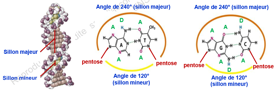 Bonjour, j'ai une petite question par rapport au cours, dans le diapo du prof il y marqué:(coef sillons) les bases exposent des sites donneurs et accepteurs d'hydrogènes pour former des LH avec des protéines.