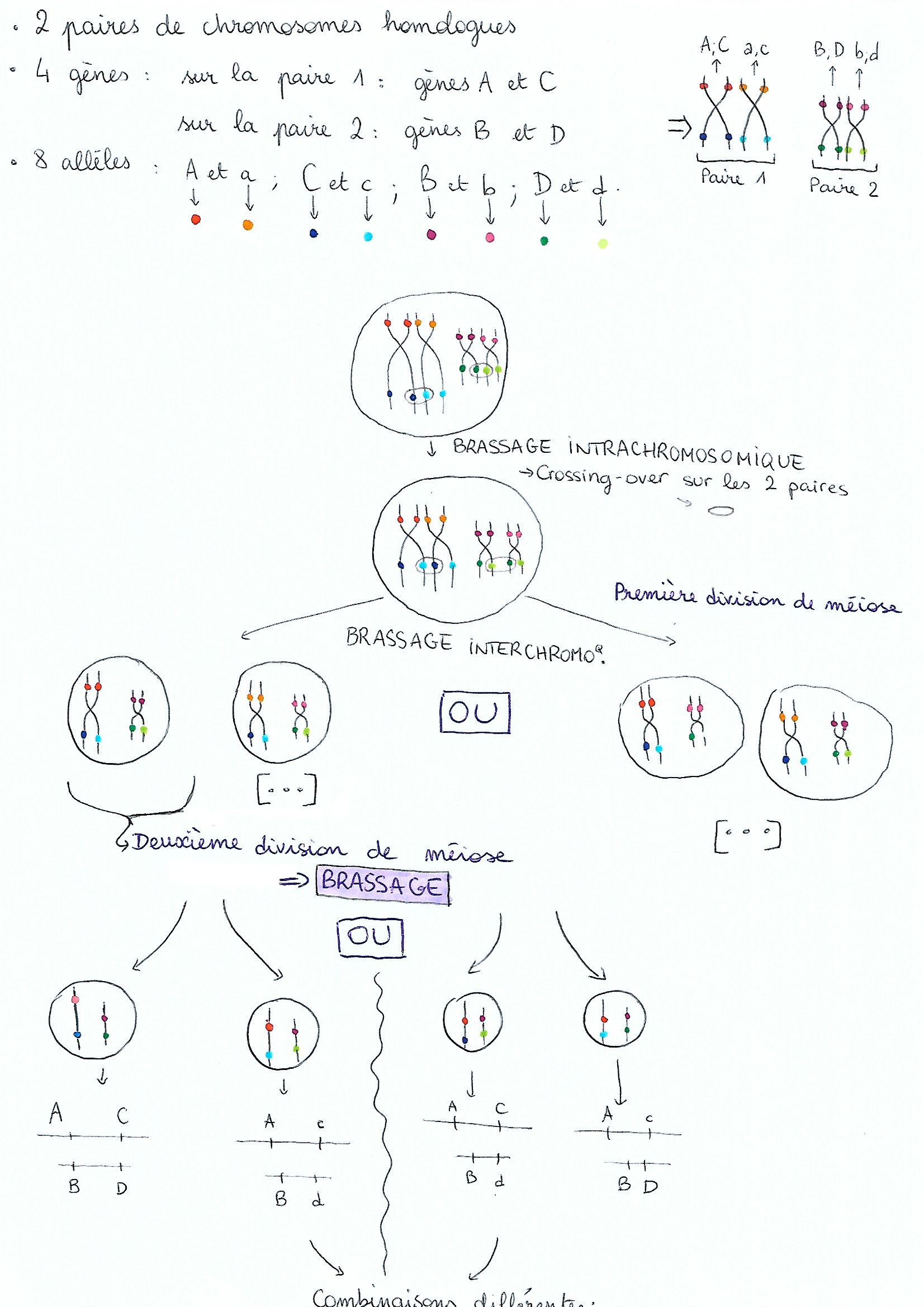 Je ne suis qu'une petite primante mais j'ai réfléchi à la question avec un schéma. Je suis partie du principe qu'il y avait deux paires de chromosomes, portant chacun deux gènes (déclinés en deux allèles) : cela fait donc 4 gènes et 8 allèles au total