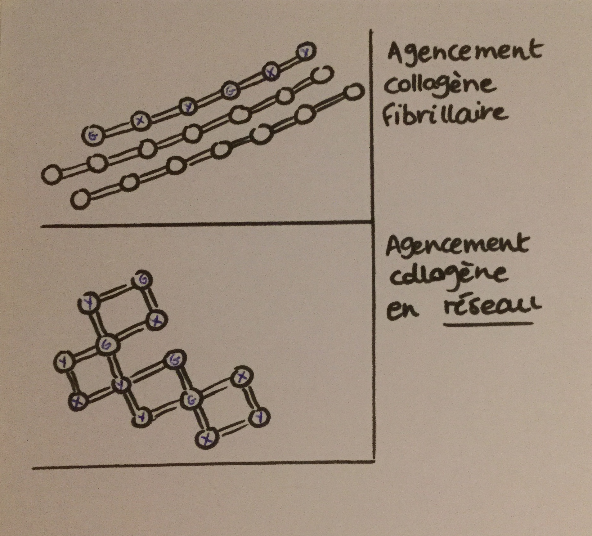 en réseau: on va vouloir fabriquer des réseaux/tapis de collagène plutôt que des câbles, on ne va donc pas hésiter à briser les enchaînements tripeptidiques (GLY-X-Y) pour fabriquer des tapis de collagène et donc des structures qui nous conviennent. On ne se contente plus de tirer des câbles linéaires de collagène. (On le voit bien sur le schéma que je t’ai fait)