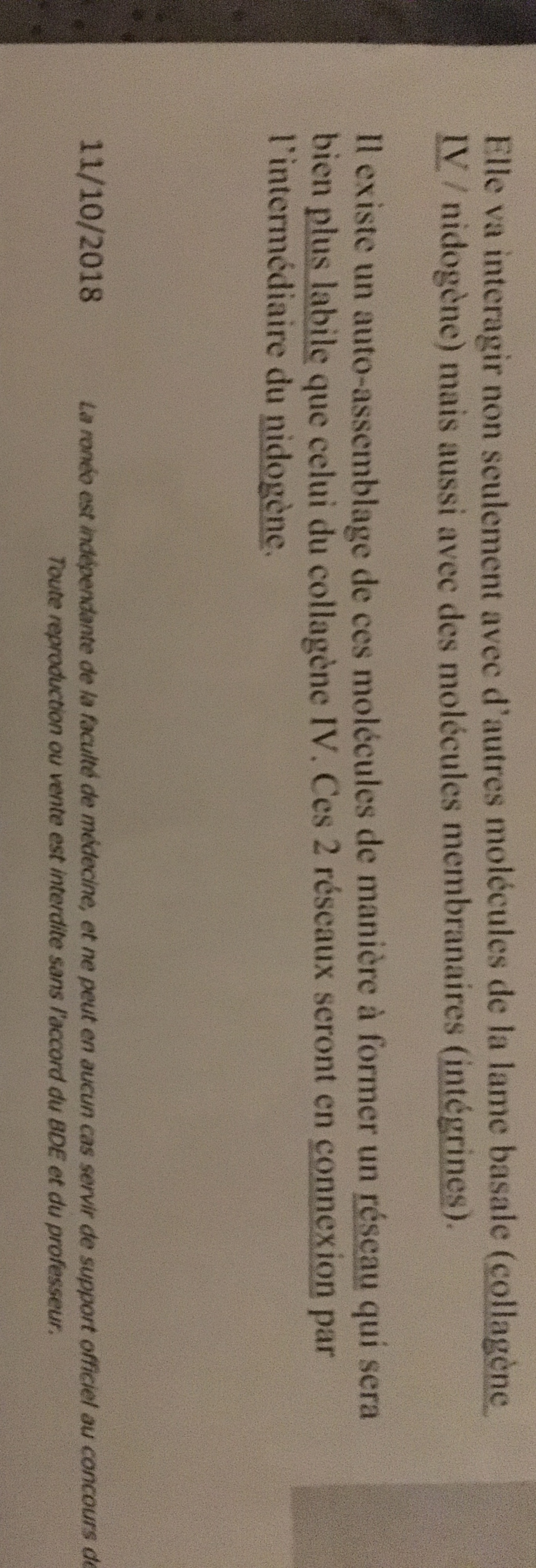 le prof dit que le réseau formé par auto-assemblage des laminine et le réseau formé du collagène IV seront en contact par l'intermédiaire du nidogène. alors que au début il disait que la laminine était capable de se lié directement au collagène IV