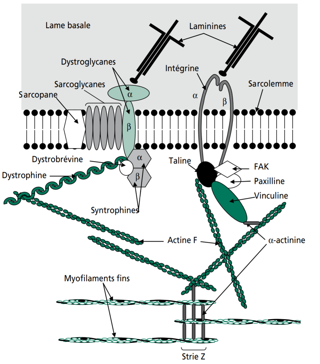 Tu as ta dystrophine qui est entièrement sarcoplasmique, elle va alors se lier à la portion intracellulaire de la β-dystroglycane. Je te rappelle que la β-dystroglycane est une molécule transmembranaire, elle traverse donc totalement la membrane. Ainsi, sa portion extracellulaire se lier à à l'α-dystroglycane qui elle se trouve en extracellulaire.