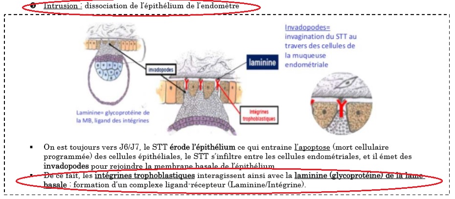 coucou pour cette item : A) Durant l’étape d’intrusion (ou dissociation), on a une interaction entre l’œuf et la lame basale avec les intégrines trophoblastiques qui jouent le rôle de récepteur et la laminine (glycoprotéine de la lame basale) jouant le rôle de ligand.