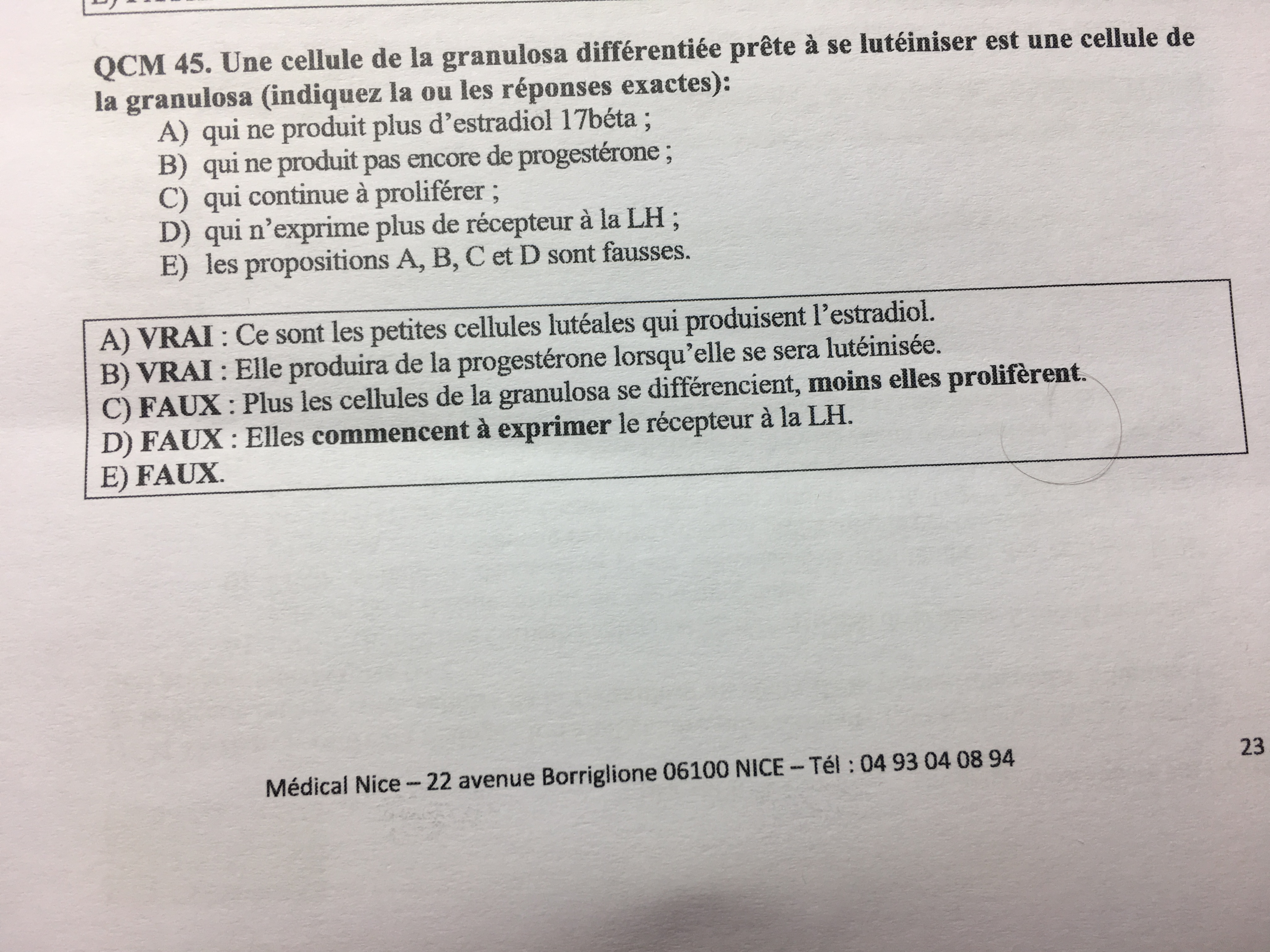 A) Faux : Elle continue à en produire ! B) Faux : Elle commence à sécréter de la progestérone ! C) Faux : Elle à achever sa prolifération ! D) Faux : Elle exprime des Récepteurs à la LH E) Vrai.