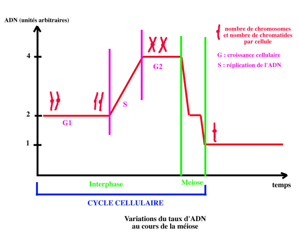 Entre la 1ère et la 2ème division de méiose, il n'y a pas ces phases (G1, S, G2) donc il n'y a pas de réplication de l'ADN. C'est comme ça qu'on aboutit à 4 cellules haploïdes avec des chromosomes simples brins.