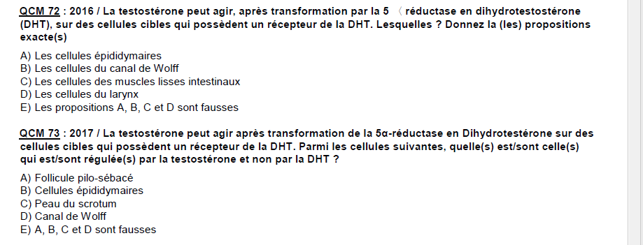 Dans le 1er on nous demande quels structures ne sont pas régulées par la DHT mais par la testo, et les C epididymaires sont comptées justes, et la correction justifie bien que les 2 autres items sont fauc car ont un Rc a la DHT (ce qui voudrait dire que les C epididymairss nont pas de Rc a la DHT). Mais 5 qcm plus loin on demande quelles C peuvent transformer les androgènes en oestrogenes, et les C epididymaires sont comptées fausses, et la justification est qu’elles ont un Rc a la DHT...
