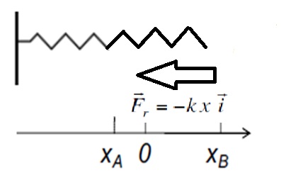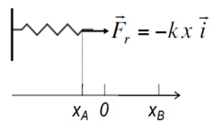 Imaginons que ton ressort de base à un point d'équilibre à x=0. Ce que tu vas faire, c'est que tu vas exercer une force qui va comprimer ton ressort dans le sens négatif pour arriver au point x=xA (je t'ai représenté cette force par une flèche rouge).