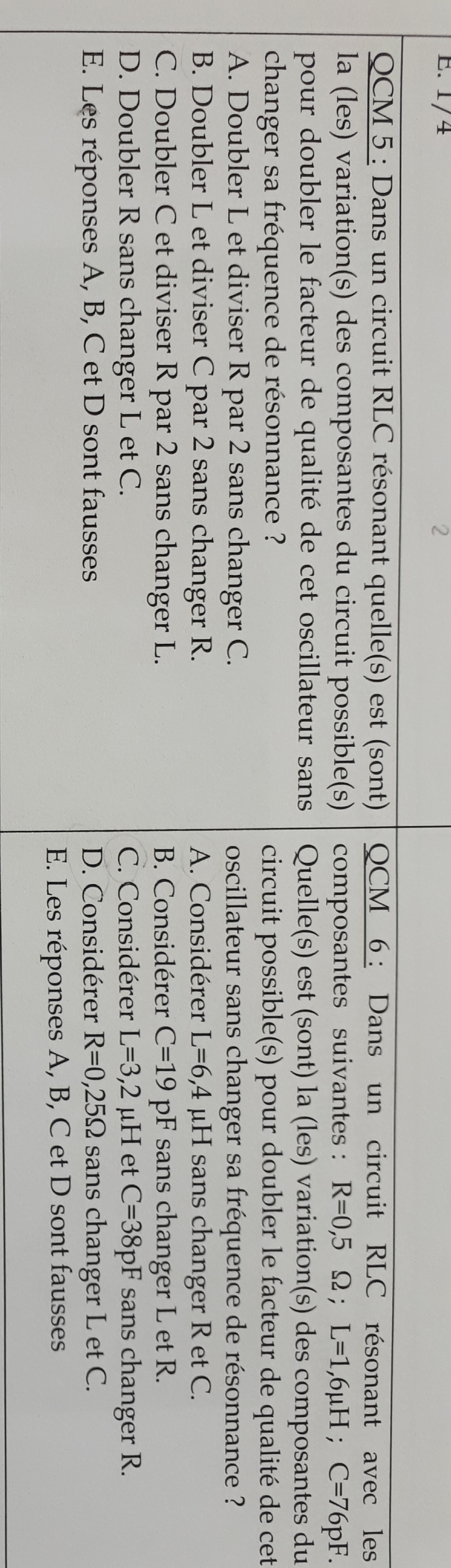 item C : on x L par 2 et on divise C par 2 donc au final, on ne modifie pas la fréquence et on double le facteur de qualité (on est dans le même cas que le QCM 5)